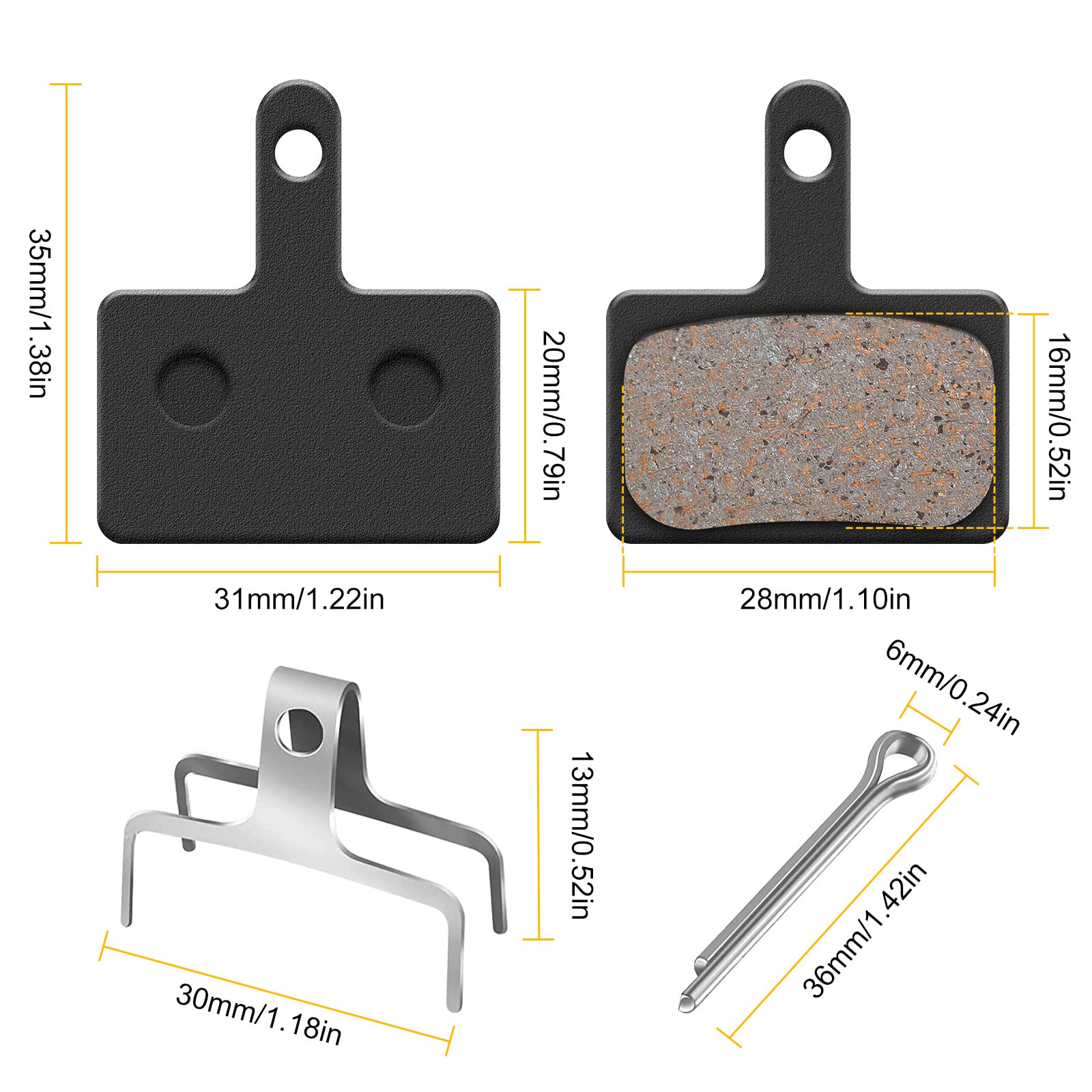 Pour les cyclistes qui veulent des freins performants et silencieux, ce kit est vraiment complet. Il contient 6 paires de plaquettes de frein à disque (soit 12 plaquettes) en matériau semi-métallique : résine et fibre de cuivre sur une plaque métallique épaisse. Ce mélange assure une bonne dissipation de la chaleur, une usure réduite et un freinage puissant, même par temps humide ou boueux. En prime, un ajusteur de rotor inclus : cet outil vous permet de centrer parfaitement l’étrier et d’éviter le frottement du disque, sans réglage manuel fastidieux. Les plaquettes mesurent environ 3,5 cm x 3,1 cm et sont compatibles avec de nombreux modèles Shimano : M515, M525, C501, M415, M510, M375, etc. (vérifiez bien la forme avant achat). Freinage progressif, durée de vie allongée (jusqu’à 3500 km), et montage facile. À remplacer quand l’épaisseur reste inférieure à 0,9 mm. Idéal pour VTT, vélo de route ou urbain. Contenu : 6 paires de plaquettes + 1 ajusteur de rotor. Matériau : résine + fibre de cuivre + plaque métal. Couleur : noir.